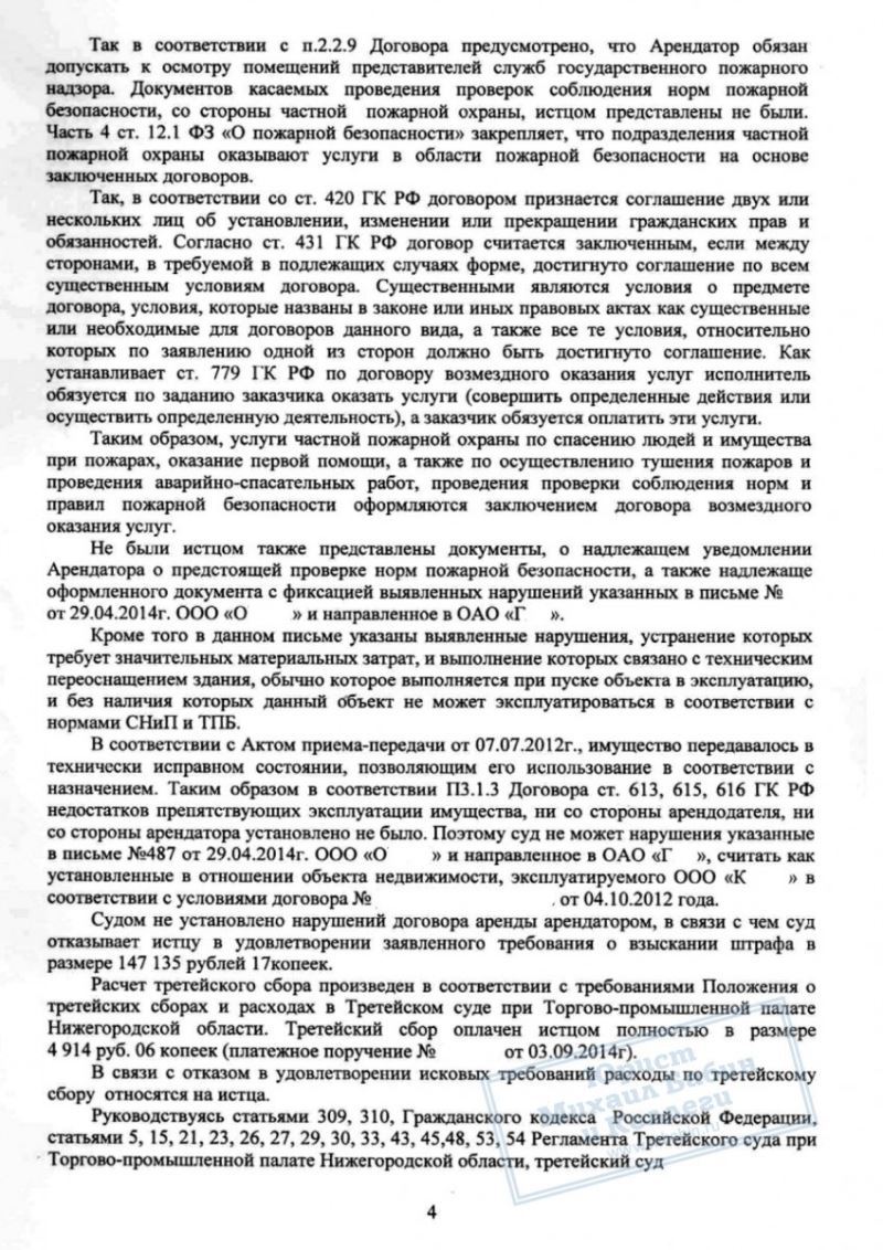 Однако, при внимательном изучении дела оказалось, что достоверность результатов проверки вызывает серьезные сомнения. Юрист также подготовил убедительные доказательства того, что ООО «К» добросовестно выполнял условия эксплуатации арендуемого помещения.