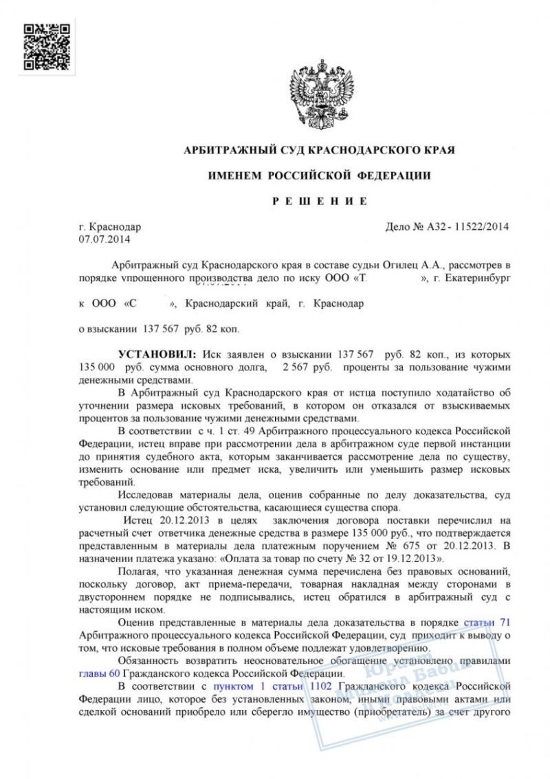 Клиент обратился за правовой помощью. Юристы подготовили исковое заявление о взыскании неосновательного обогащения в размере 135 000 руб., а также процентов за пользование чужими денежными средствами. Дело рассмотрено Арбитражным судом Краснодарского края в порядке упрощённого производства. В ходе рассмотрения истец заявил отказ от требования о взыскании процентов, который был принят судом.