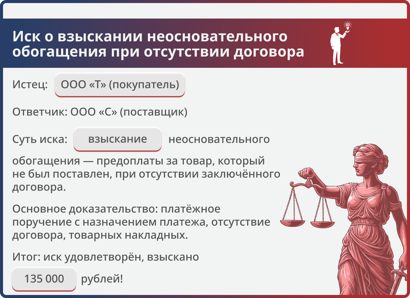Покупатель перечислил предоплату, но договор поставки так и не был заключён, товар не отгружен. Юрист доказал, что полученная сумма является неосновательным обогащением, и суд взыскал её в полном объёме.