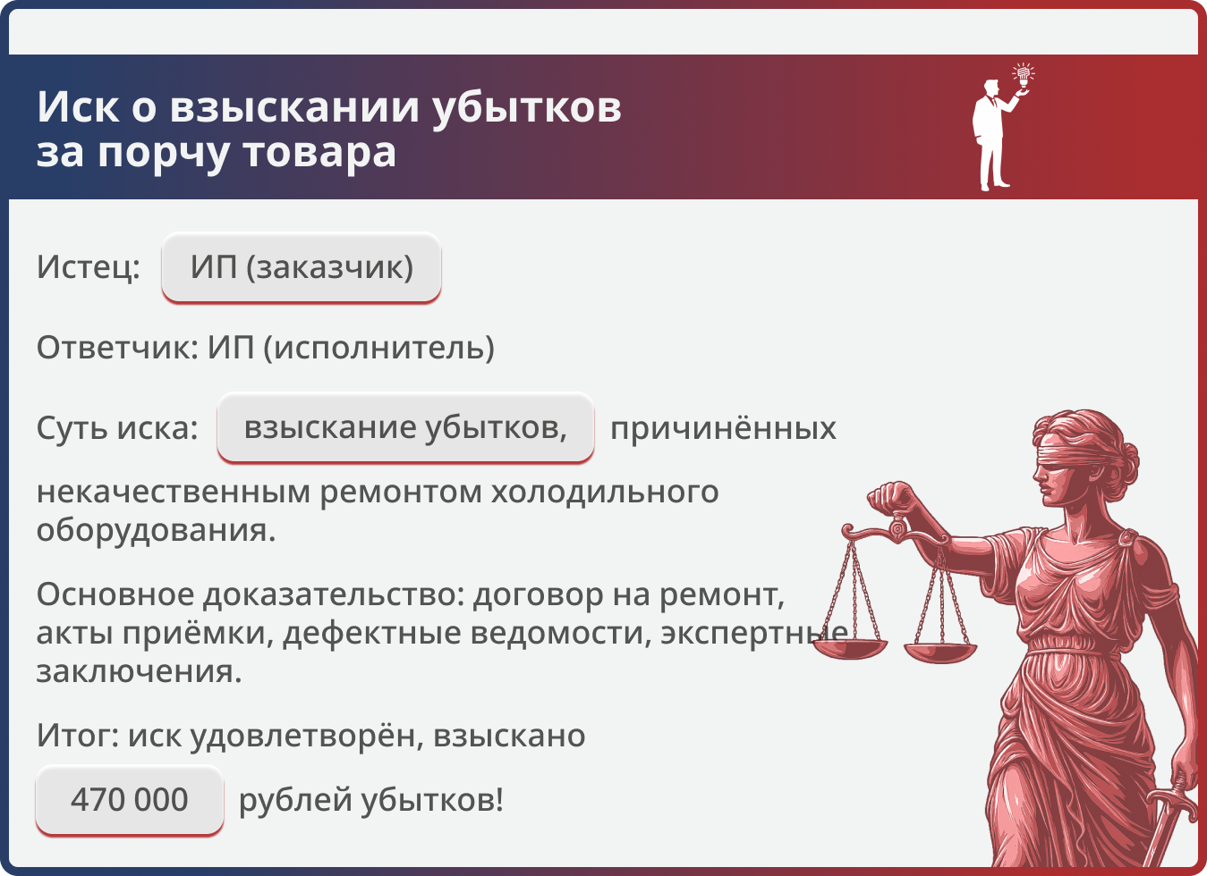 - убытки в размере 470 000 руб., а также судебные расходы (государственная пошлина, расходы на экспертизу, юридические услуги).