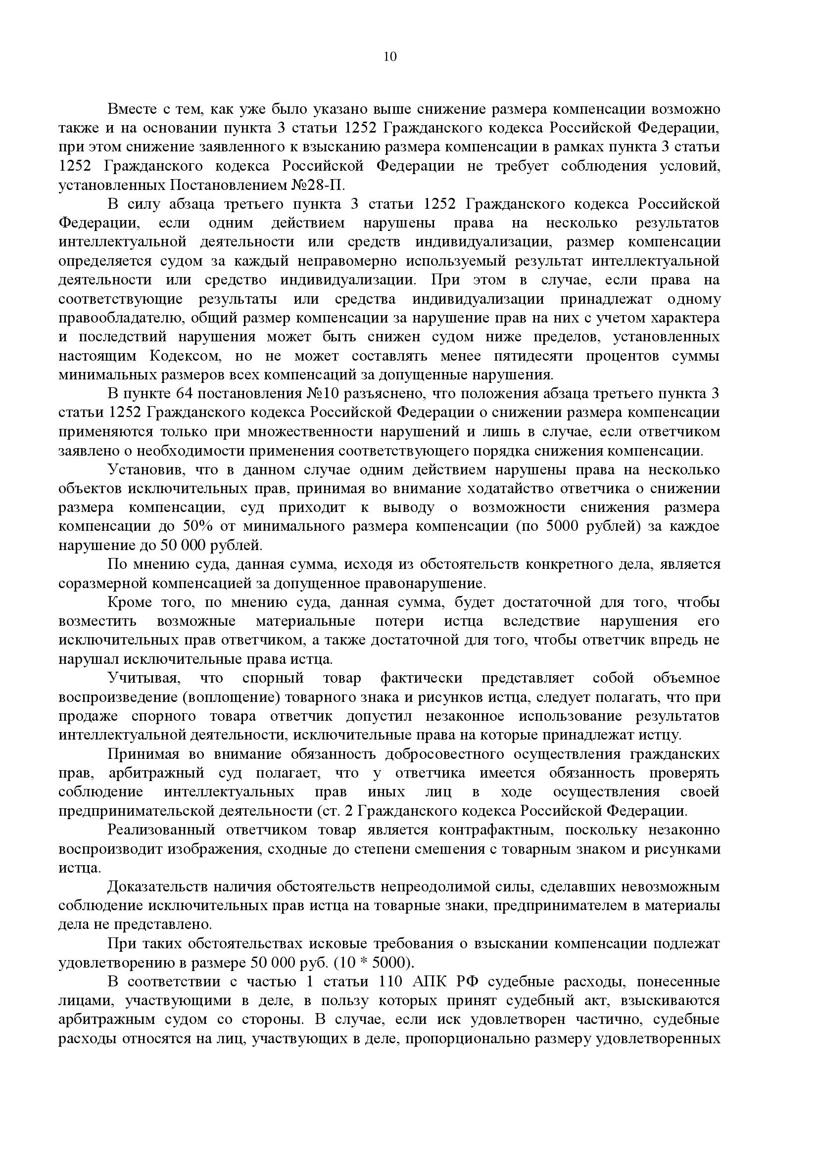 Защита настаивала на применении абзаца 3 пункта 3 статьи 1252 ГК РФ, согласно которому при нарушении одним действием прав на несколько объектов, принадлежащих одному правообладателю, общий размер компенсации может быть снижен судом ниже минимальных пределов, но не менее 50% от суммы минимальных размеров всех компенсаций. Также обращалось внимание на то, что истец не обосновал известность персонажей российскому потребителю и возможные убытки, а ответчик ранее привлекался к ответственности, что исключало снижение ниже 50%.