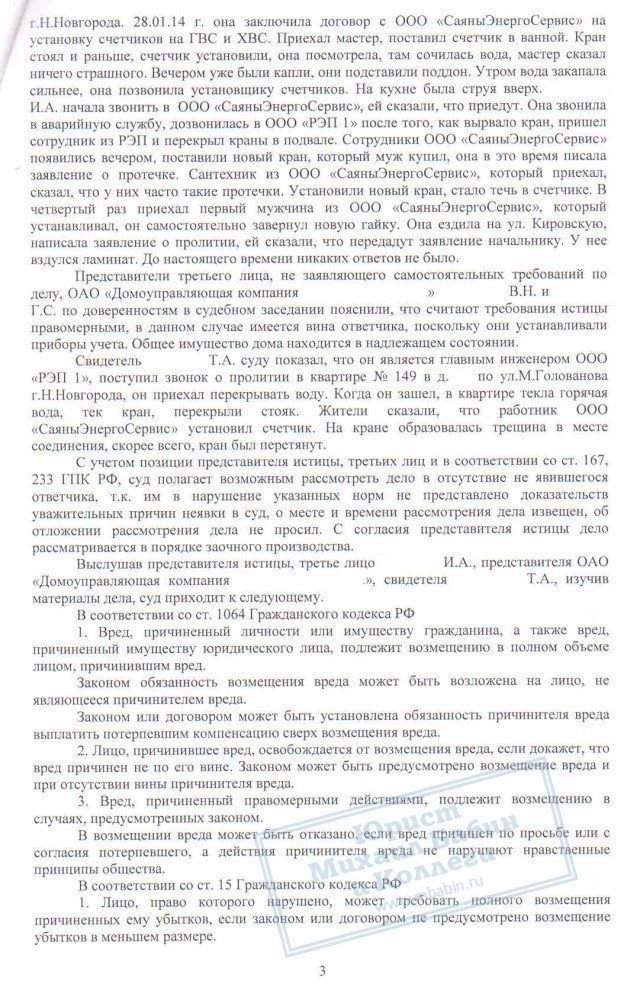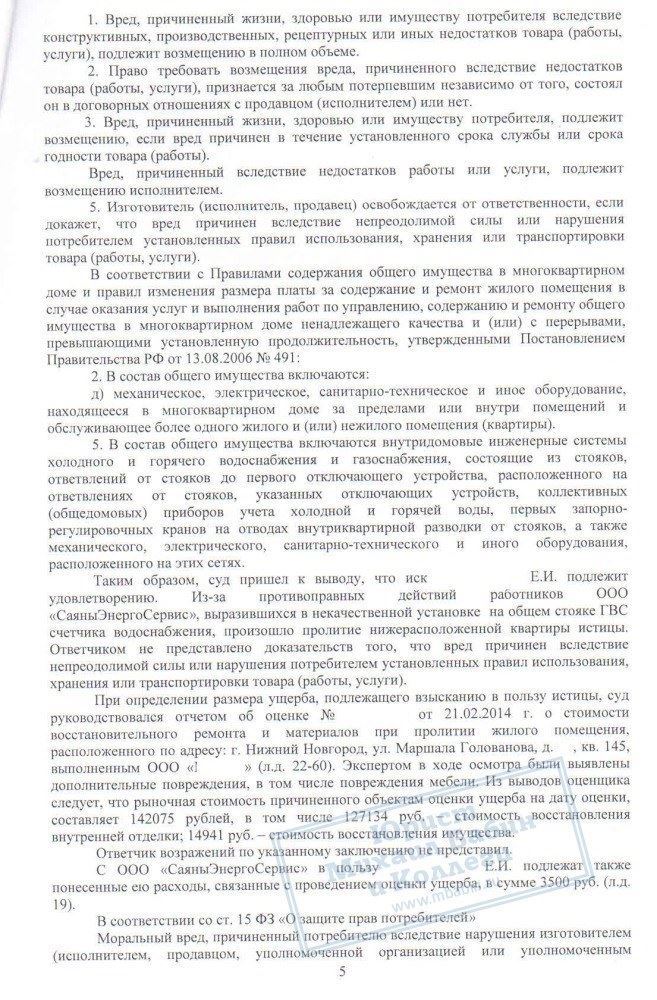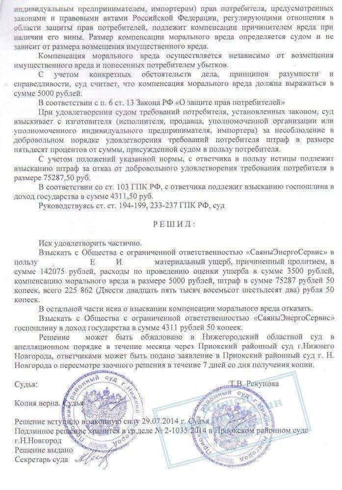 В результате деньги были взысканы с коммунальщиков, причём в сумме более 220 000 рублей, что в 2 раза превышает стоимость ремонта. Таким образом, Е.И. возмещены все неудобства, связанные с проливом квартиры, включая моральный вред.